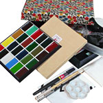 顔彩に筆2本、梅皿、和紙ハガキなどが入ったセット。絵手紙用におすすめ。